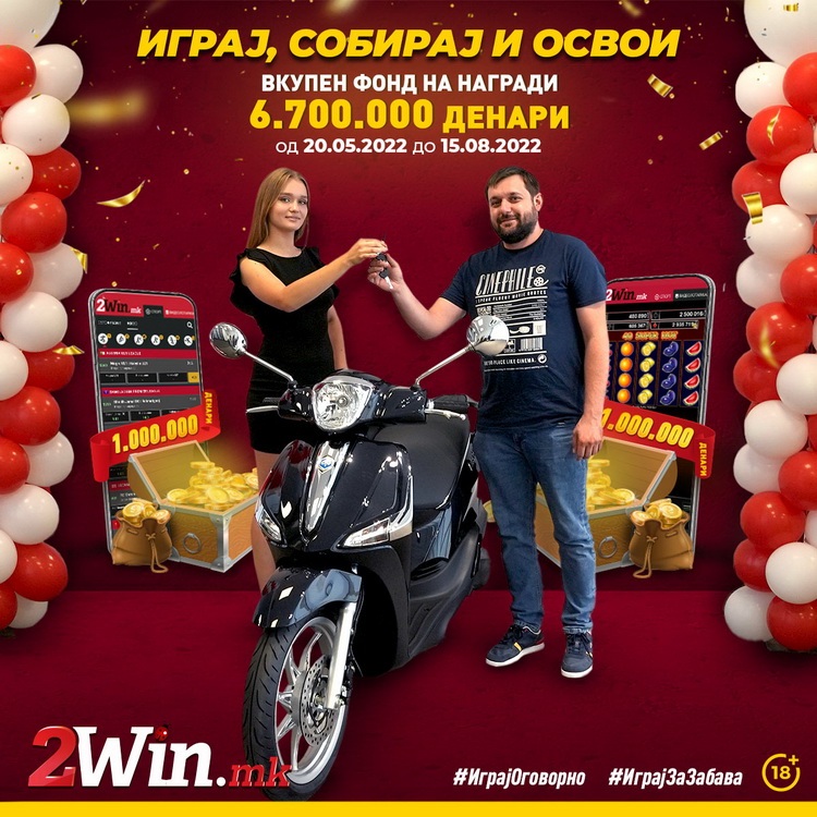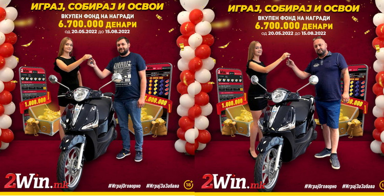 Сашко Трајчески го подигна својот мотор скутер Piaqqio, наградата која ја освои учествувајќи во наградната игра, во категоријата видеолотариски игри. Истата награда ја освои и Ивица Зарков во категоријата спортско обложување на играчката платформа 2win.mk. Наградите ги освоија во првото коло од наградната игра. И двајцата добро расположени, споделија дека ќе продолжат да играат со надеж дека ќе освојат и други награди, а милионот им е главен предизвик.