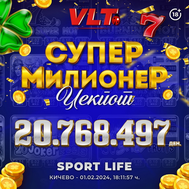 А.П. од Кичево со супер добивка го почна месец февруари. Тој го освои најпосакуваниот ВЛТ џекпот на Видеолотарија Касинос Австрија, СУПЕР МИЛИОНЕРОТ вреден 20.768.497 денари.
