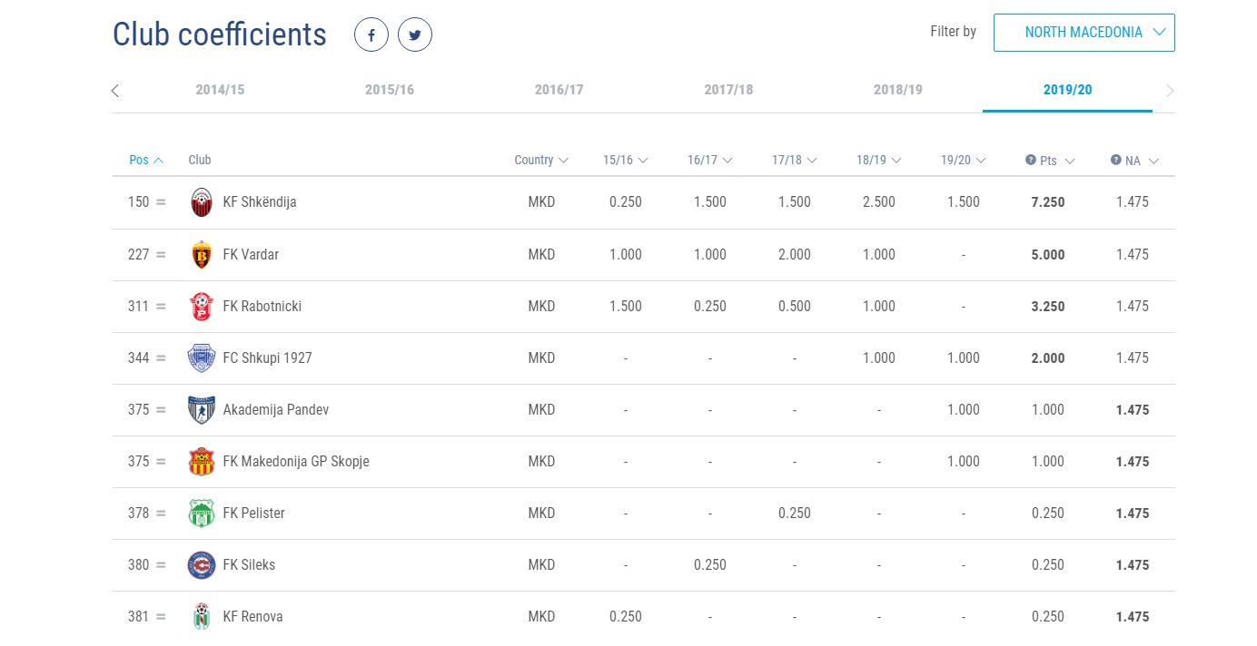 Еве како изгледа рангирањето на македонските екипи во УЕФА според клупскиот кофициент.