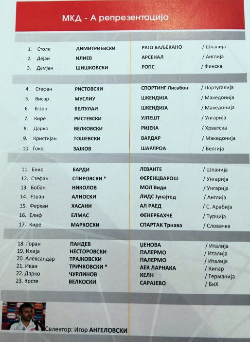 Како што беше најавено и претходно, на списокот се и Иван Тричковски и Стефан Спировски иако поради повреди неизвесно е колку ќе може да помогнат за двата натпревари.