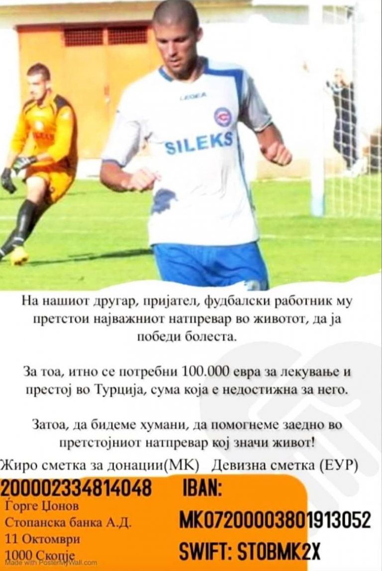 „На нашиот другар, пријател, фудбалски работник му претстои најважниот натпревар во животот, да ја победи болеста. За тоа, итно се потребни 100.000 евра за лекување и престој во Турција, сума која е недостижна за него. Затоа, да бидеме хумани, да помогнеме заедно во престојниот натпревар, кој значи живот“ – се вели во повикот преку социјалните медиуми.
