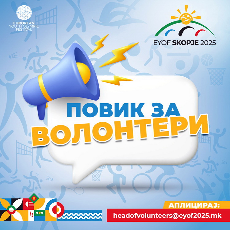 Европскиот Младински Олимписки Фестивал – ЕМОФ Скопје 2025, кој ќе се одржи од 20 до 26 јули во Скопје и Куманово, претставува најголемиот спортски настан што досега се организирал во нашата земја. За успешно спроведување на овој значаен фестивал, потребна е поддршка од голем број млади луѓе кои ќе се вклучат како волонтери и ќе станат дел од тимот што ќе го претстави Скопје и Македонија пред илјадници учесници и гости од цела Европа.