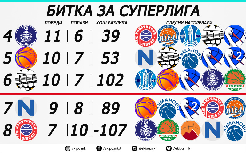 Македонската прволигашка кошарка и оваа сезона е крајно изедначена, а како што се приближуваме до крајот на регуларниот дел, очекувано, дел од работите остануваат нејасни. Засега е познато дека Пелистер, МЗТ Скопје и Гостивар имаат загарантирано место во Суперлигата и дека Кожув, Куманово, МЗТ Скопје 2 и Ангели ќе се борат во плеј-аутот, но на пет кола пред крајот, пет тима остануваат во игра за две места кои водат во победничката фаза.