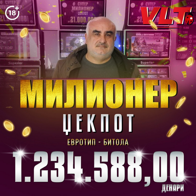 Роберт Јосифовски од Битола е најновиот среќен милионер на Видеолотарија Касинос Австрија. Додека многумина празнуваа, тој забавувајќи се на видеолотариските терминали на Евротип во Битола, стана сопственик на МИЛИОНЕР ЏЕКПОТ. Освоената добивка МИЛИОНЕР ЏЕКПОТ на 14.02.2023 е вредна 1.234.588,00 денари.