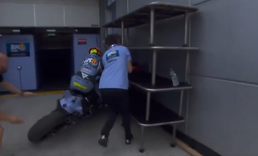Шпанскиот мотоциклист падна и на стазата во текот на квалификациите, но стана хит на социјалните мрежи по сударот во боксот каде не успеа да го запре својот мотор.