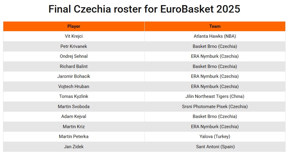 Чешка веќе е и без искусниот центар Јан Весели, па се очекува сега целиот товар да падне врз Вит Крејци, бекот кој во НБА-лигата ги брани боите на Атланта хоукс.