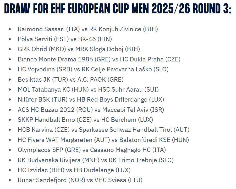 Според ждрепката, првиот дуел ќе се игра викендот 15/16 ноември во Охрид, а реваншот седум дена подоцна во Добој.