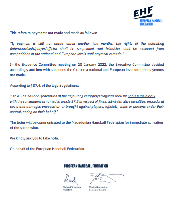 ЕХФ во приложеното писмо бара од РФМ „експресна активација“ на суспензијата, нешто што македонската куќа на ракометот го стори, поради што не беше одигран денешниот дуел со Вардар.