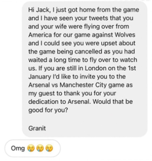 „Поздрав Џек. Видов дека ти и твојата сопруга допатувавте од САД да го гледате мечот, и видов дека си разочаран што е натпреварот одложен. Ако сте во Лондон на 1. јануари, сакам да ве повикам на мечот Арсенал – Манчестер Сити да бидете мои гости и да ви се заблагодарам што сте толку посветени на нашиот клуб. Дали тоа ви одговара?“, напишал Џака.