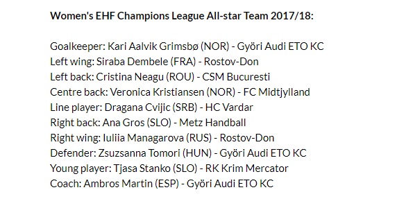 За најдобра одбранбена ракометарка е избрана Сузана Томори (Ѓер), а најдобра млада ракометарка е Тјаса Станко (Крим).
