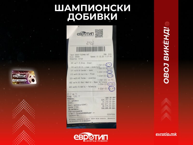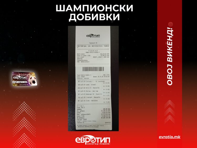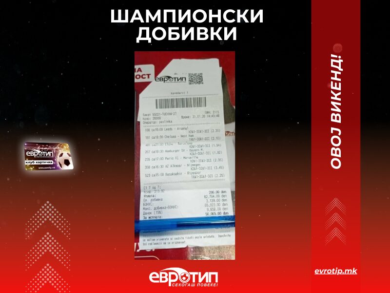 Среќата беше на страната на нашите играчи, кои со точни прогнози го одбележаа викендот со низа добитни тикети. Возбудата, адреналинот и победничкиот дух повторно беа заштитен знак на Евротип. Евротип продолжува да биде место каде што се создаваат победници, а секој нов тикет носи нова шанса за успех.
