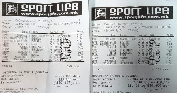 Тикетот од 10 натпревари со квоти од 1,82 до 2,60 го уплатил еднаш со 750 денари за погодок на сите 10 меча, а веднаш потоа истиот тикет го одиграл во систем – 8 од 10, за влог од 4.000 денари. И двата тикета биле со максимална добивка од милион денари и двата успеал да ги освои и да оствари двојна милионска добивка.