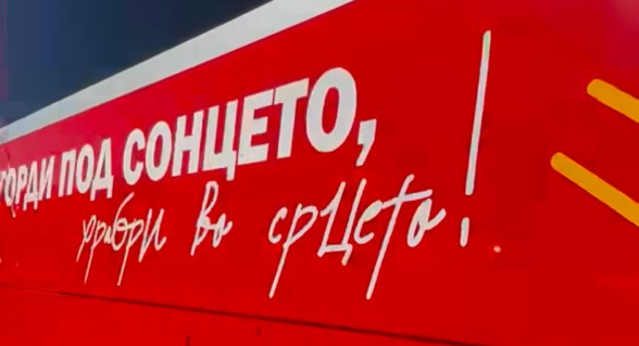 На автобусот стои натпис „Горди под сонцето, храбри во срцето“, во боите на македонското знаме „црвено-жолти“.
