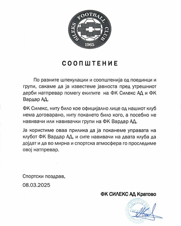 Силекс се огласи со соопштение по повод информацијата дека ги поканила навивачите на Вардар да дојдат и да присуствуваат на утрешниот меч во Кратово. Од Силекс демантираат дека ги договориле или поканиле навивачите на Вардар.