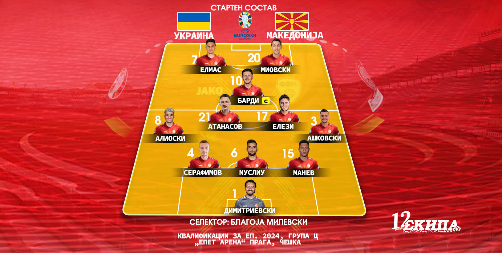 Селекторот Благоја Милевски одлучи со кои 11 ќе стартува против Украина. Согласно најавите на ЕКИПА, Македонија тргнува со речиси истиот состав како против Италија, со само една принудна измена. На местото на Зајков ќе игра Серафимов. Зајков ќе го нема поради повреда која ја доби на минатиот дуел со Малта.