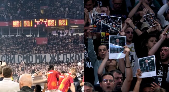 Кошаркарите на Партизан беа жестоко исвиркани од своите навивачи и при претставувањето на нивите имиња, притоа со полна сала фотографии од Жељко Обрадовиќ… „Гробари“ истакнаа и транспарент: „Сите сме Жељко“.