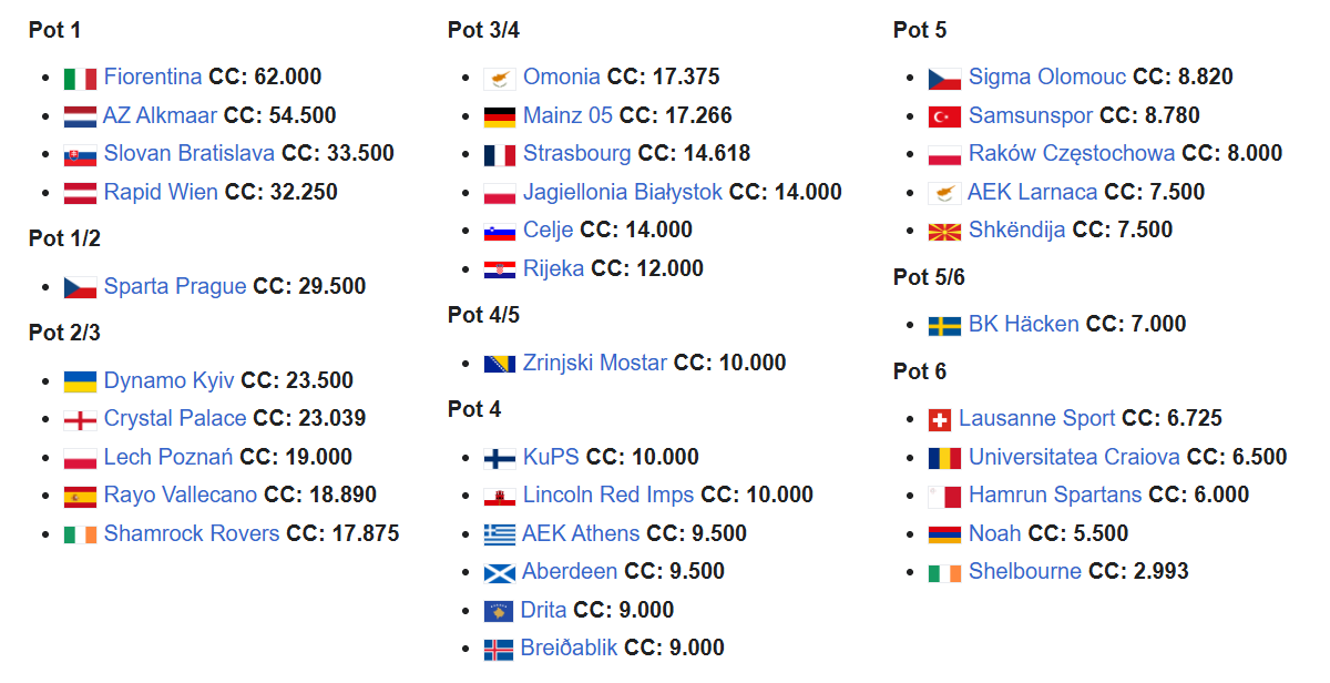 Шкендија ќе биде сместена во петтиот шешир. Таму се сигурни Сигма Оломуц, Самсунспор, Раков, АЕК Ларнака и Хакен, со тоа што може да им се приклучат и други клубови, затоа што уште некои натпревари не се завршени.