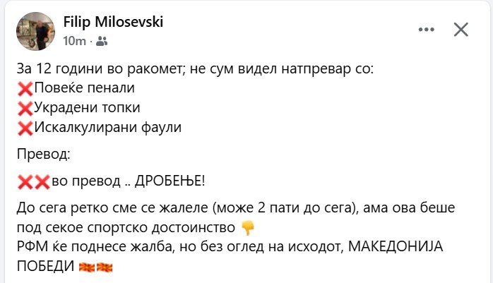 По мечот со свој став излезе и генералниот секретар на РФМ Филип Милошевски кој изјави дека куќата на ракометот во Македонија ќе упати жалба за судењето на натпреварот против Холандија.