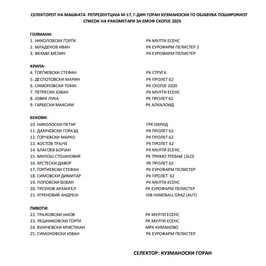 Селекторот на машката репрезентација до 17 години, Горан Кузманоски го објави поширокот спиосок на ракометари повикани за претстојниот Европски младински фестивал Скопје 2025.