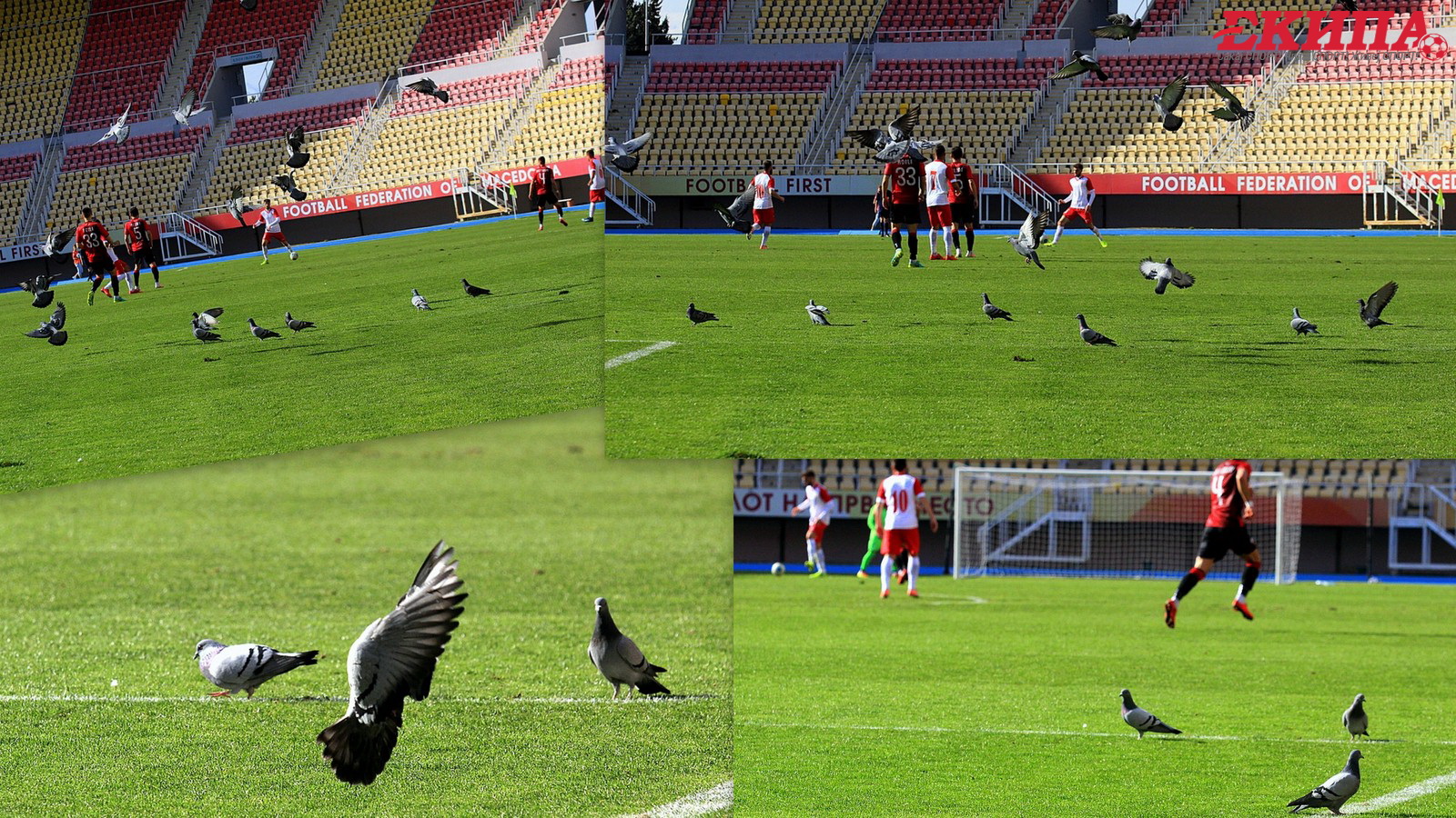 Широко и зелено…Се игра фудбал, ама тоа и ретко наликува – на фудбал. Си знаат гулабите, па си го „освоија“ теренот на арената „Филип Втори“. А си бранеа територијата и денеска, додека фудбалерите на Работнички и на Шкендија го играа првенствениот натпревар од 23.коло во Првата фудбалска лига.
