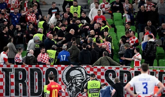 По водството на Шпанија од 2-0, дојде до немири и физичка пресметка меѓу хрватските навивачи и обезбедувањето во салата.