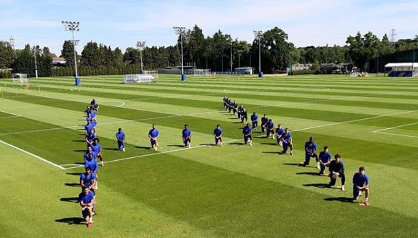 Вчера фудбалерите на Ливерпул на тренинг клекнаа на колена како поддршка за протестите во САД, а денеска истото го направија и нивните колеги од Челси.