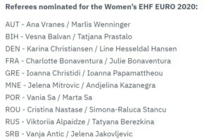 Европското првенство за ракометарки кое ќе се одржува во декември годинава во Норвешка и во Данска во буквална смисла ќе биде комплетно женско. Ова ќе биде првиот шампионат во историјата на ракометот на кој ќе судат само женски судијки. ЕХФ ја објави листата на десетте номинирани двојки кои ќе ја делат правдата на првенството од 3. до 20. декември.