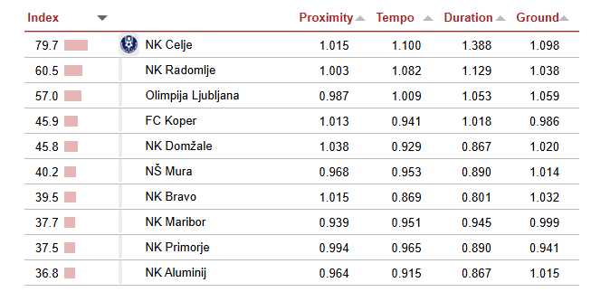 Барајќи ги „тимови што се најпријателски настроени кон топката“, во преден план ја издвојуваат играта на Радомље кој е на второто место во Словенија, веднаш зад неприкосновениот Целје, како тим кој игра најфлуиден, доминантен и отворено атакувачки модерен фудбал. Рангирањето се базира на четири критериуми: близина на додавањата (колку пократко толку подобро), темпо на додавања за време на посед, времетраење на посед на топка и процент на примени топки во противничката третина под колена (т.е. на земја).