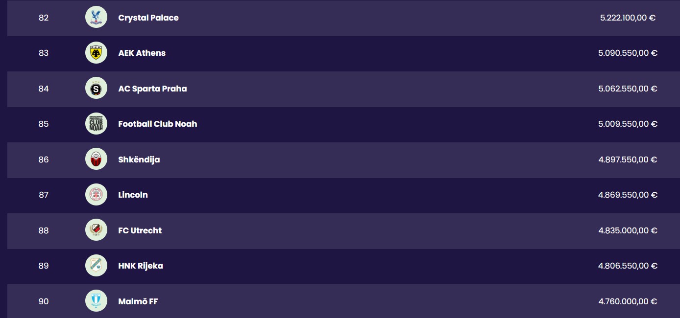 Пред Шкендија на ова рангирање според досегашната европска заработка се наоѓаат премиерлигашот Кристал Палас, потоа АЕК Атина, Спарта Прага и ерменскиот клуб Ноа, а веднаш зад тетовци се наоѓаат Линколн, Утрехт, Ријека, Малме…