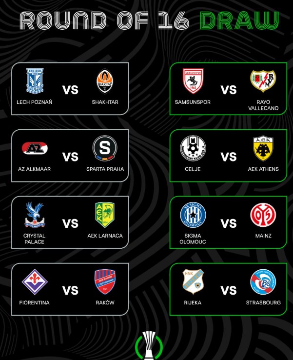 Самсунспор по елиминацијата на Шкендија сега за противник ќе го има тимот на Рајо Валјекано, АЗ Алкмар ќе се сретне со Спарта Прага, додека Кристал Палас во осминафиналето ќе игра двомеч со АЕК Ларнака.