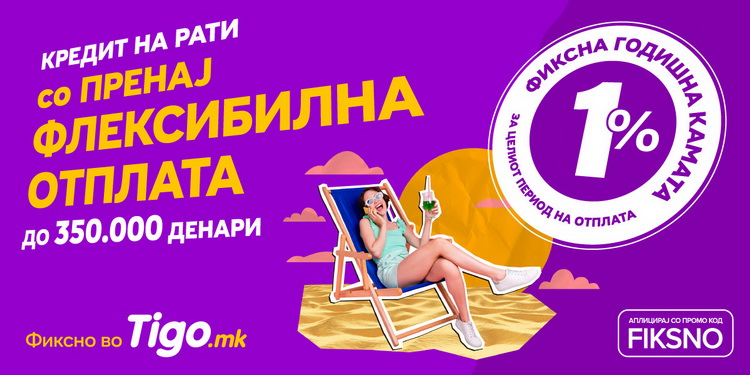 Со оваа понуда, сите нови и повторни Tigo.mk клиенти можат да ги ползуваат придобивките од понудата, и да ја добијат потребната стабилност со фиксен износ на камата од 1% за целиот период на отплата, а во исто време да уживаат во удобноста на отплатата на 3, 4, 7…8, 22 до 24 месечни рати. Без разлика дали се работи за планирање на летниот одмор, реновирање на домот или едноставно – мирно лето – Тиго е тука за да ги пресретне нивните финансиски потреби.