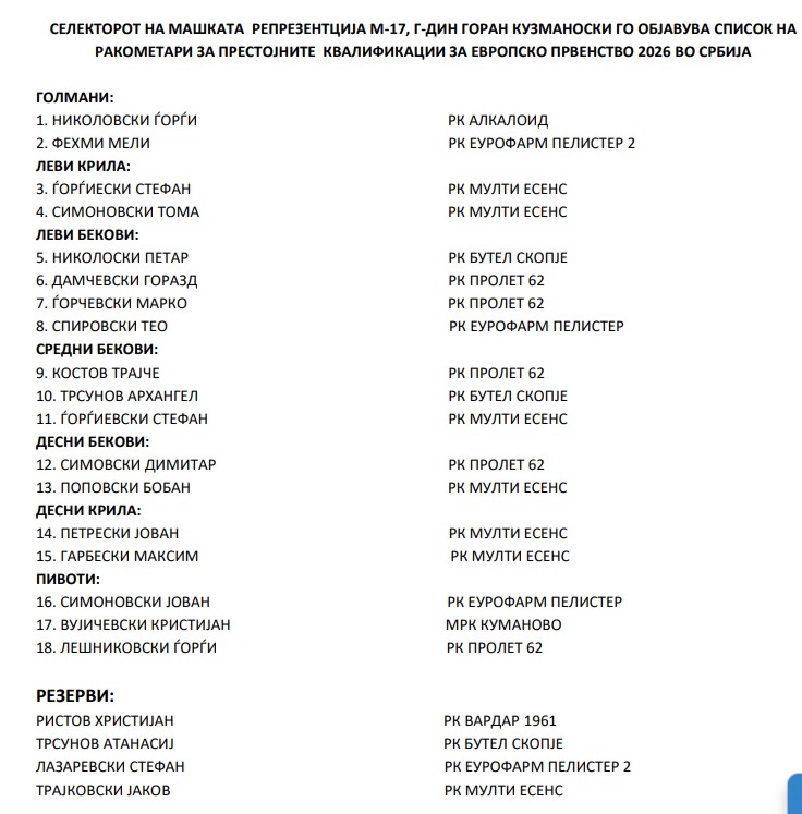 Кузманоски ги избра кадетите кои ќе бркаат билет за ЕП