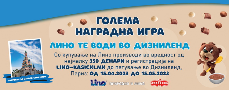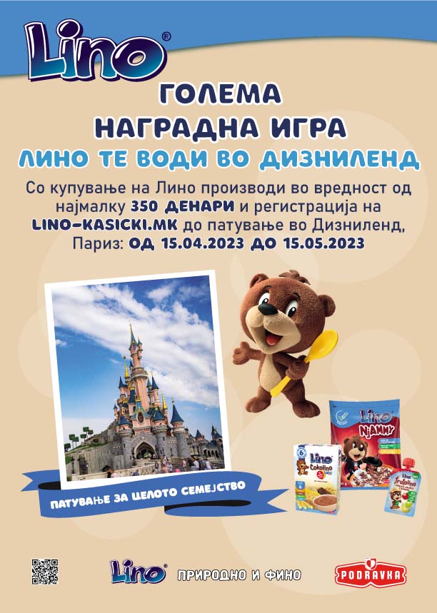 Во периодот од 15-ти април до 15-ти мај 2023 година со купување на било кој производ од брендот ЛИНО на Подравка во вредност од најмалку 350 денари можете да освоите патување за целото семејство во најпосетуваната атракција во Европа, Дизниленд, Париз. Главната награда е Лино пакет за семејството до четири члена кој вклучува хотелско сместување 4 дена и 3 ноќевања, билети за паркот Дизниленд, повратни авионски билети, трансфер до хотел и трансфер до аеродром.