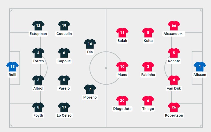 Кај Ливерпул, пак, Јирген Клоп и покрај предноста, се реши да го изведе на теренот најсилниот состав. Алисон ќе биде на голот, додека Арнолд, Конате, Ван Дајк и Робертсон стандарно во одбраната. Средината ќе биде сочинета од Кеита, Фабињо и Тиаго, додека во нападот Салах, Мане и Жота. Недостасува од првиот меч Луис Диаз кој ќе чека шанса од клупата.