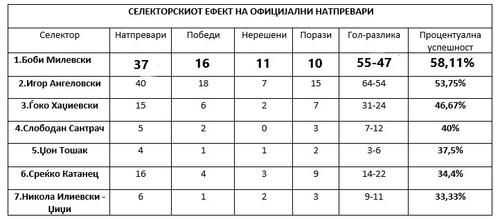 Иако, интересно е со каква леснотија Македонија во минатото менувала селектори, па поголемиот дел од нив имаат водено едвај максимум до 7-8 квалификациски натпревари, како Канатларовски (8 официјални натпревари), Јовановски (4), Илиевски (6), Сантрач (5), Јонуз (6), Тошак (4), Јаневски (9), Ѓуровски (5), Друловиќ (5)… Единствени со двоцифрен број официјални квалификациски натпревари се Дончевски (10), Хаџиевски (15), Катанец (16), Ангеловски (40) и Милевски (37).