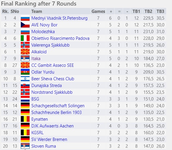 ШК Гамбит зад себе на табелата на крајот остави и тимови како Одлар Јурду од Азербејџан и Бер Шева од Израел кои беа рангирани во првите десет пред почетокот на Купот. Нов европски шампион е екипата на Медњи Всадник од Санкт Петербург, Русија, која заврши со 6 победи и еден пораз и тоа од Алкалоид.