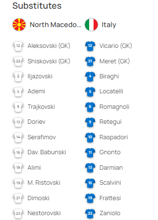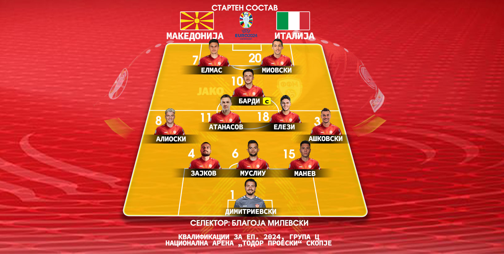 Македонската репрезентација согласно очекуваниот состав со засилен среден ред ќе се спротистави на Италија во квалификацискиот натпревар за пласман на ЕП 2024 вечерва од 20:45 часот на арената „Тодор Проески“ во Скопје.