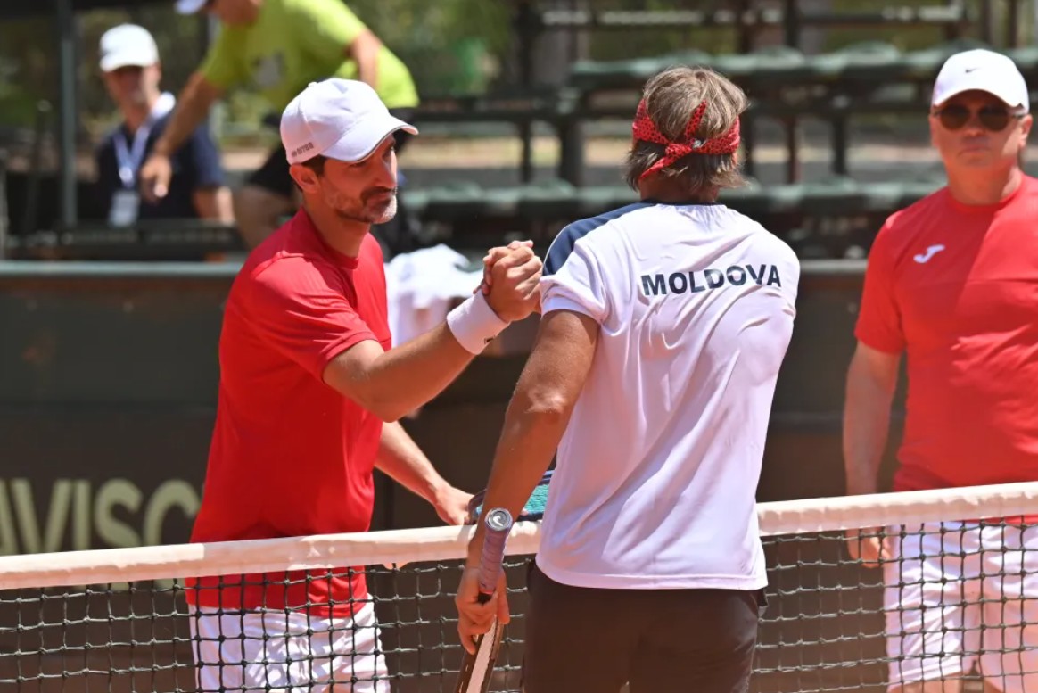 Македонската тениска репрезентација поведе во дуелот од третото коло против Молдавија со 1-0 откако Стефан Мицов успеа да го победи Андреј Горбан со 2-0 во сетови (63 64) во меч што траеше 97 минути.