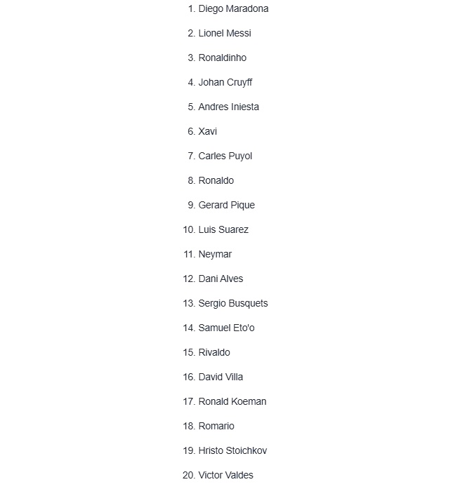 Фановите на Барселона одлучија дека Диего Марадона е сепак „поголем“ од Лионел Меси и го ставија на пиедесталот, а третото место му припадна на Бразилецот Роналдињо. Во изборот сепак одлучувачки фактор имаа карактеристиките на фудбалерот, а не освоените титули со Барселона. Четвртата позиција му припадна на холандскиот волшебник Јохан Кројф, а петти во историјата е Андрес Иниеста. Следуваат Чави, Карлес Пујол, Роналдо, Жерар Пике и Луис Суарез во првата „десетка“.