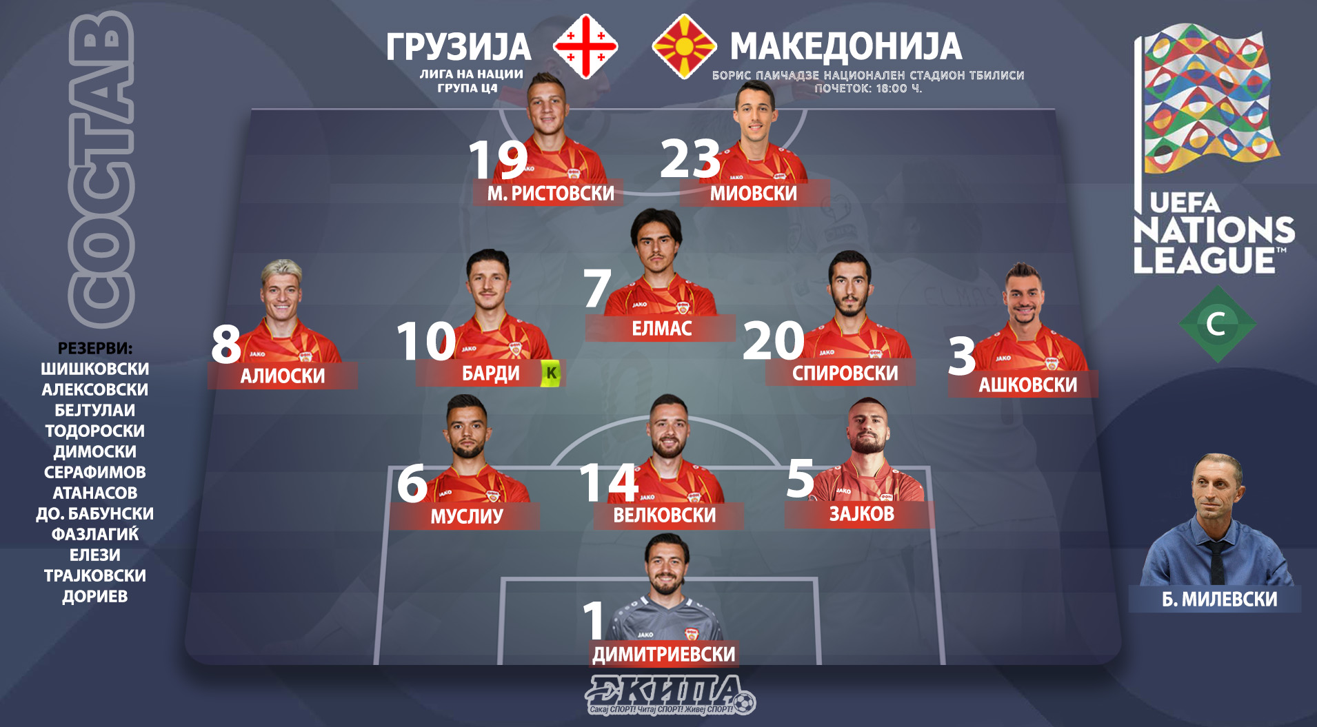 Селекторот на македонската репрезентација Благоја Милевски, ги одреди стартните 11 за дуелот со Грузија вечерва во Тбилиси. Милевски се одлучи да ја смени тактиката, и да игра со тројца стопери, односно со формација 3-5-2.