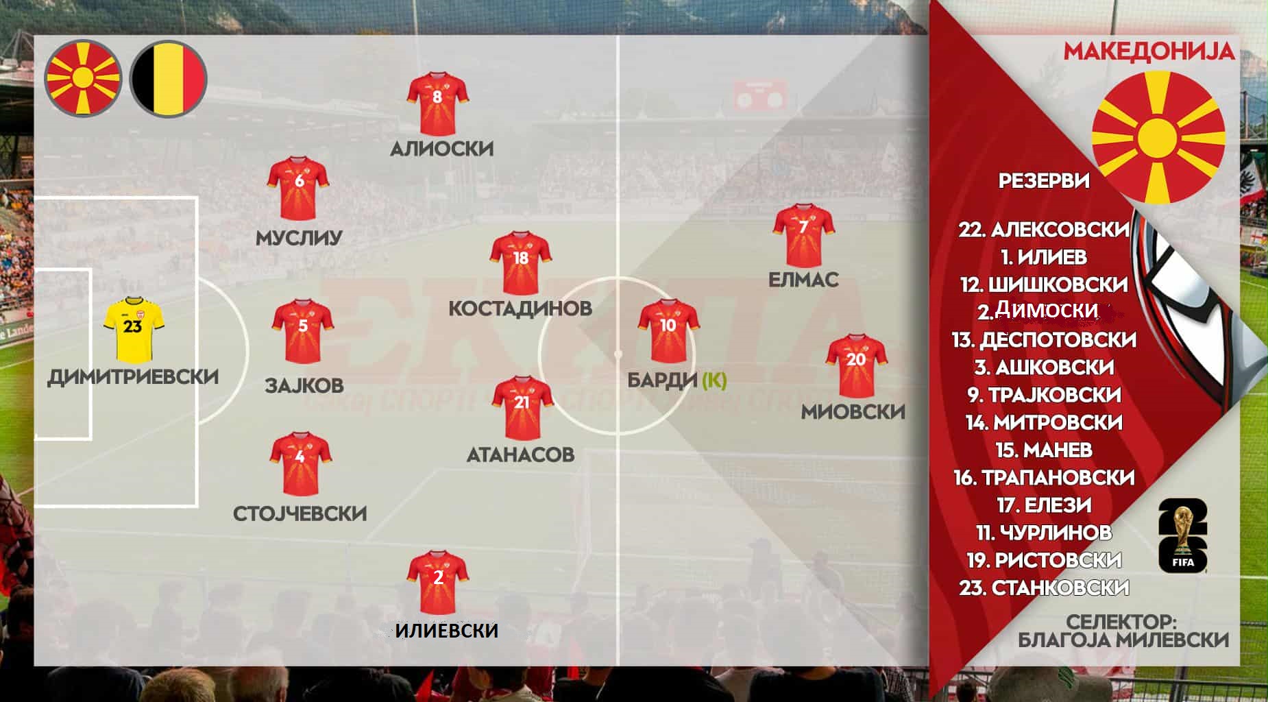 Селекторот Благоја Милевски со најавениот состав ќе се спротистави на Белгија вечерва од 20:45 часот на арената „Тодор Проески“ во третиот квалификациски натпревар за пласман на СП 2026.