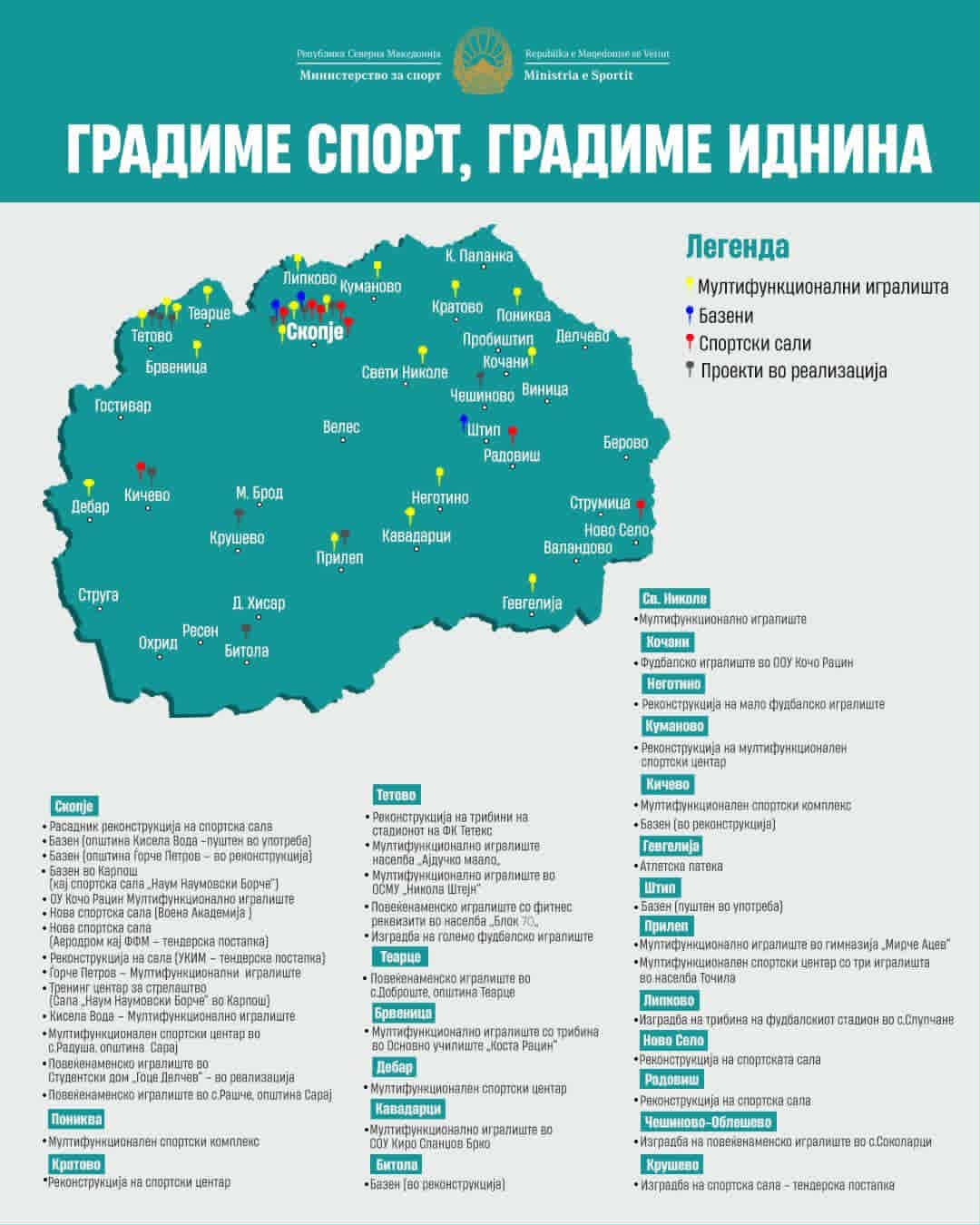 Во рамките на оваа заложба, Министерството за спорт реализира 41 инфраструктурен проект во 22 општини. Изградени и реконструирани се над 30 мултифункционални спортски центри, изградена е атлетска патека во гевгелија, целосно реконструирани се неколку спортски сали, а започна и постапката за изградба на три нови спортски сали – во Воената академија во Скопје, во општина Аеродром (кај ФФМ) и во Крушево.