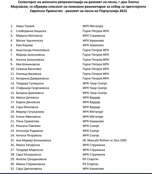 Селекторот на женската ракометна репрезентација на песок, Златко Мојсовски го објавува списокот на повикани ракометарки за собир и настап за претстојното Европско Првенство – ракомет на песок кое ќе се оддржи во градот Назаре во Португалија во период од 24. до 28. мај.