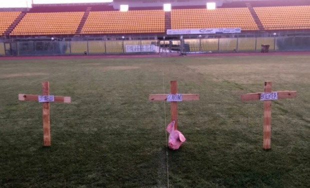 Во текот на вчерашниот ден на стадион се појавија три крста со имиња на челниците на клубот, отсечена свинска глава и порака: „Ќе платите за се. Скапо ќе платите!“