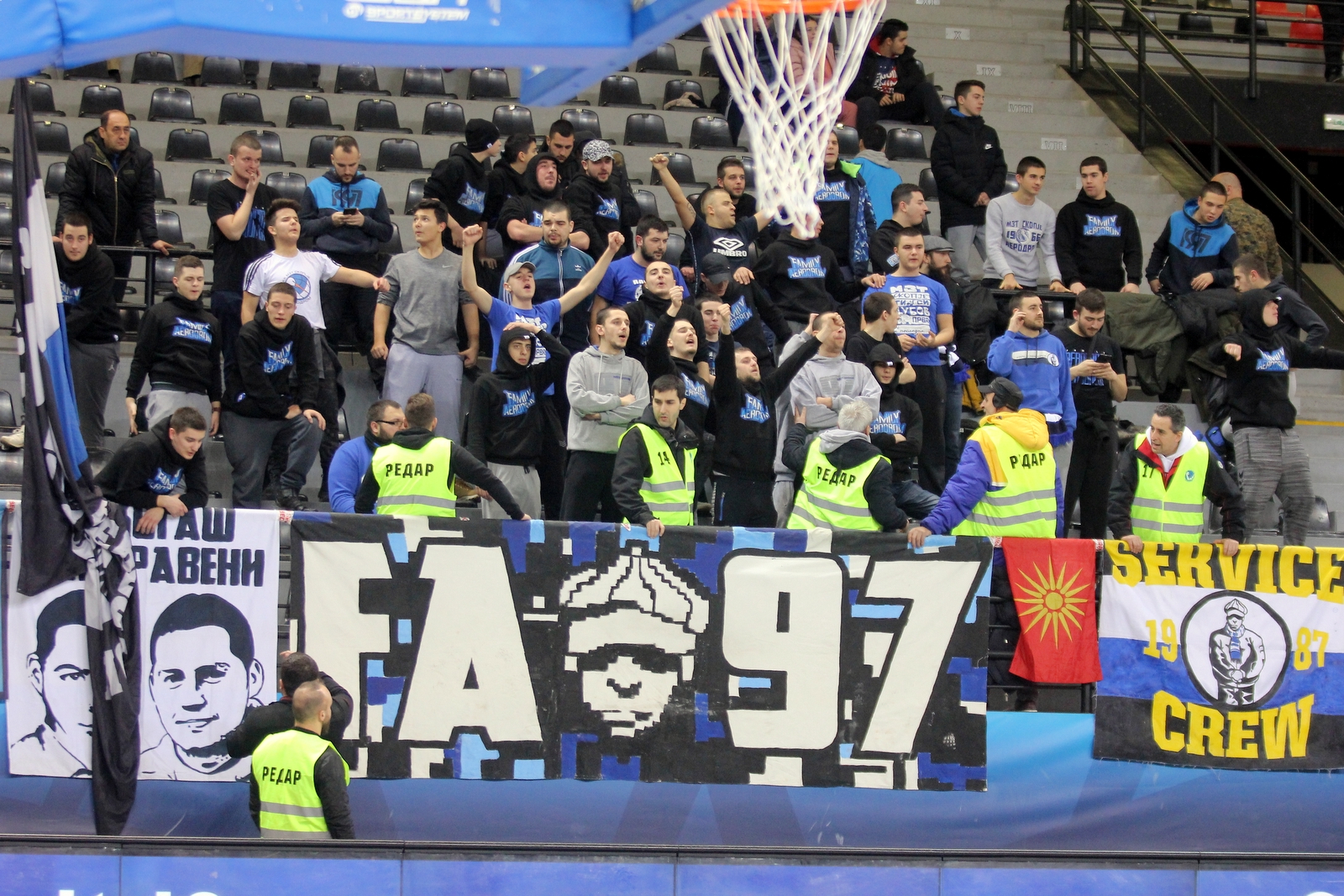 На пет минути пред крајот, судиите побараа навивачката група „Фемили Аеродром“ да ги напушти трибините, а откако средбата продолжи се случи уште еден прекин, на две минути пред крајот. Поради непристојни скандирања кон судиите, арбитрите побараа да биде испразнета комплетната сала за да може мечот да се приведе до крај.
