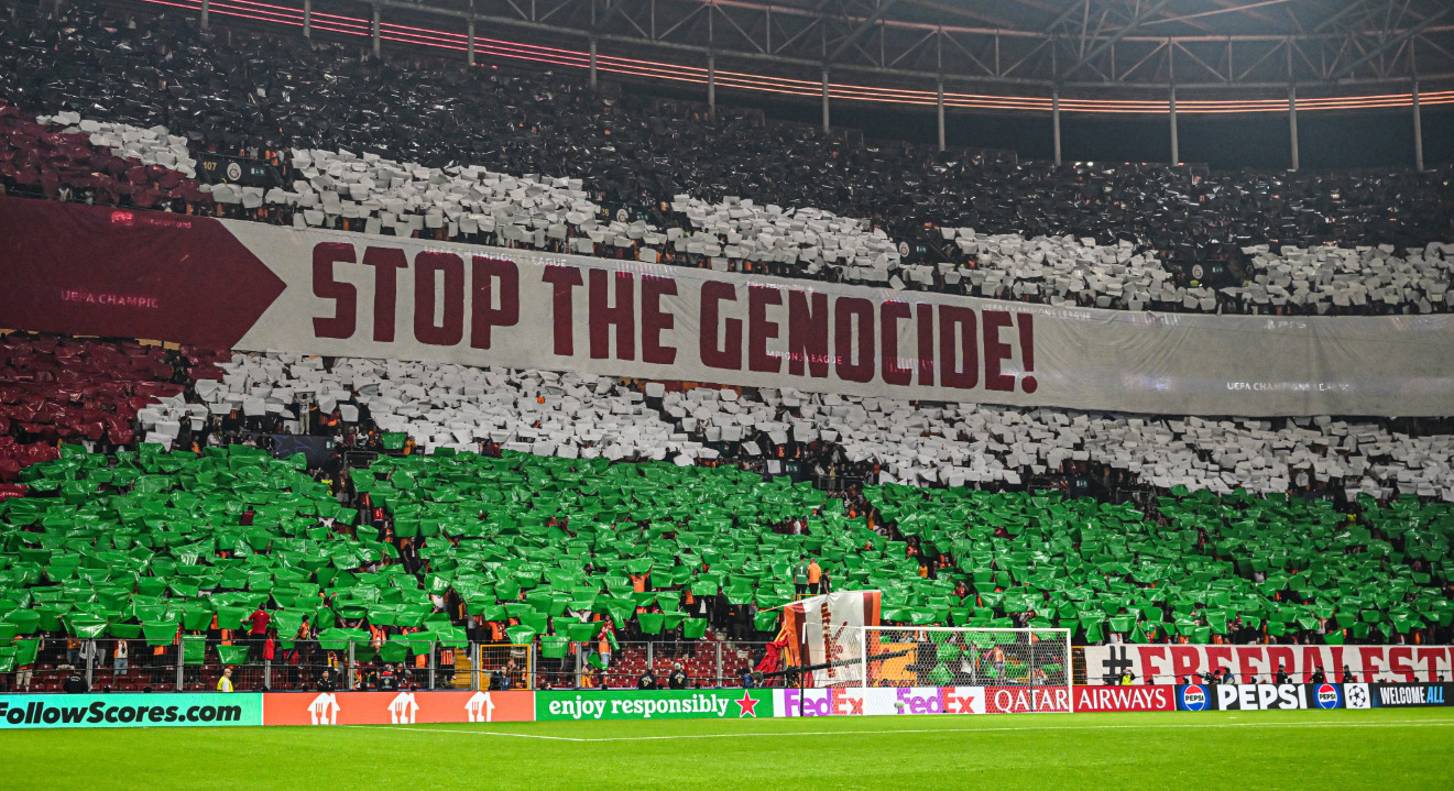 Навивачите на турскиот великан во текот на мечот истакнаа транспарент со поддршка за Палестина во војната со Израел.