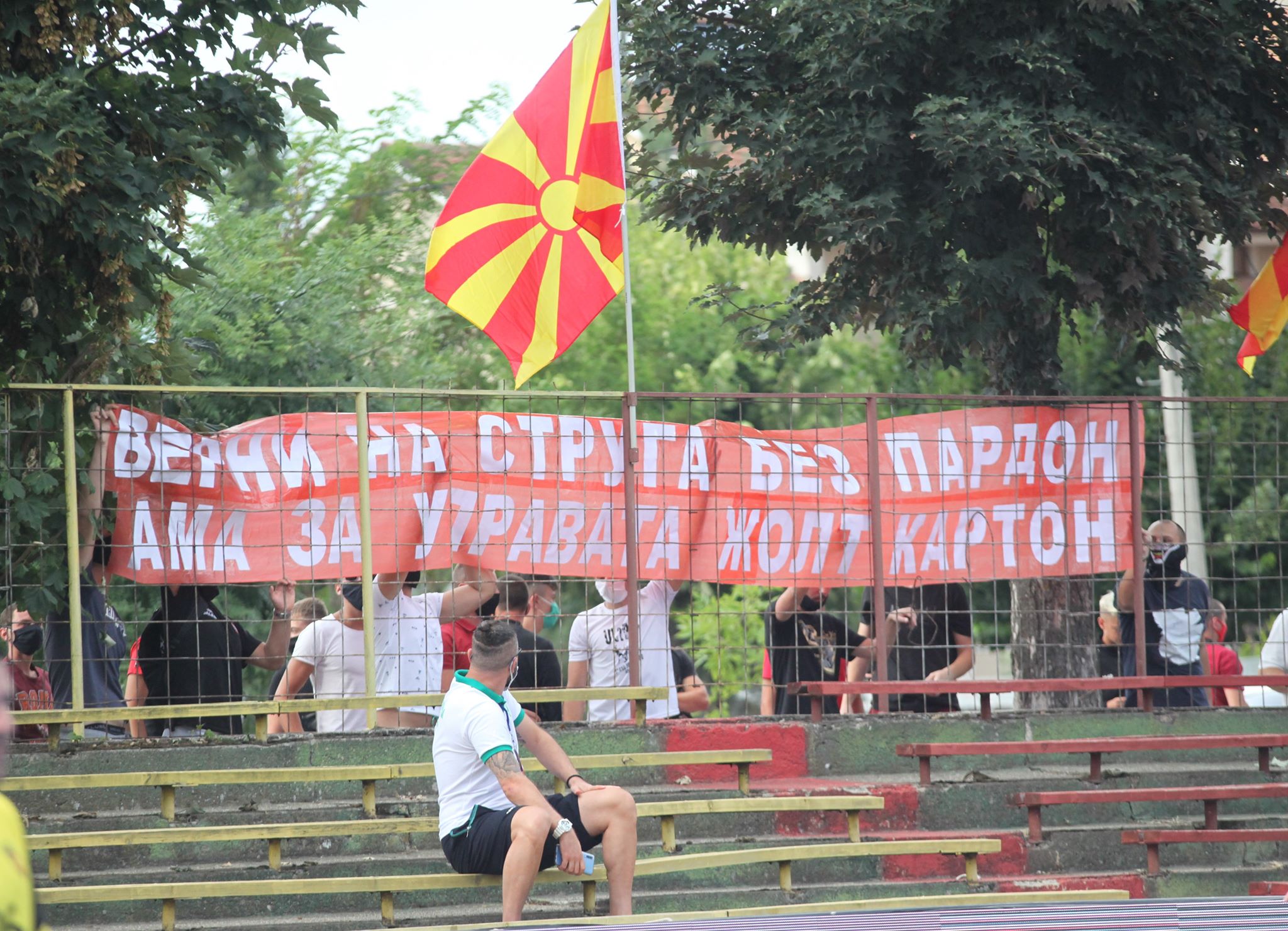 Навивачката група „Паткари“ се појави веднаш зад трибината на теренот каде се играше натпреварот, истакнувајќи транспарент: „Верни на Струга без пардон, ама за управата жолт картон“.