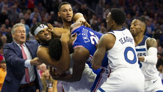 Џоел Ембид и Карл Ентони Таунс беа исклучени на мечот меѓу Минесота и Филаделфија во НБА лигата поради жестока физичка пресметка, но сега „воените секири се закопани“ кога животот е во прашање.