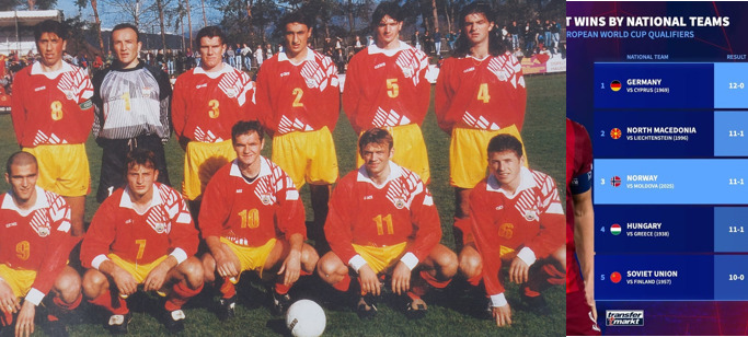 Норвежаните во актуелните квалификации за СП 2026 славеа против Молдавија со 11-1, што е еднаква победа како и онаа гостинска победа на Македонија против Лихтенштајн од 1996 година.