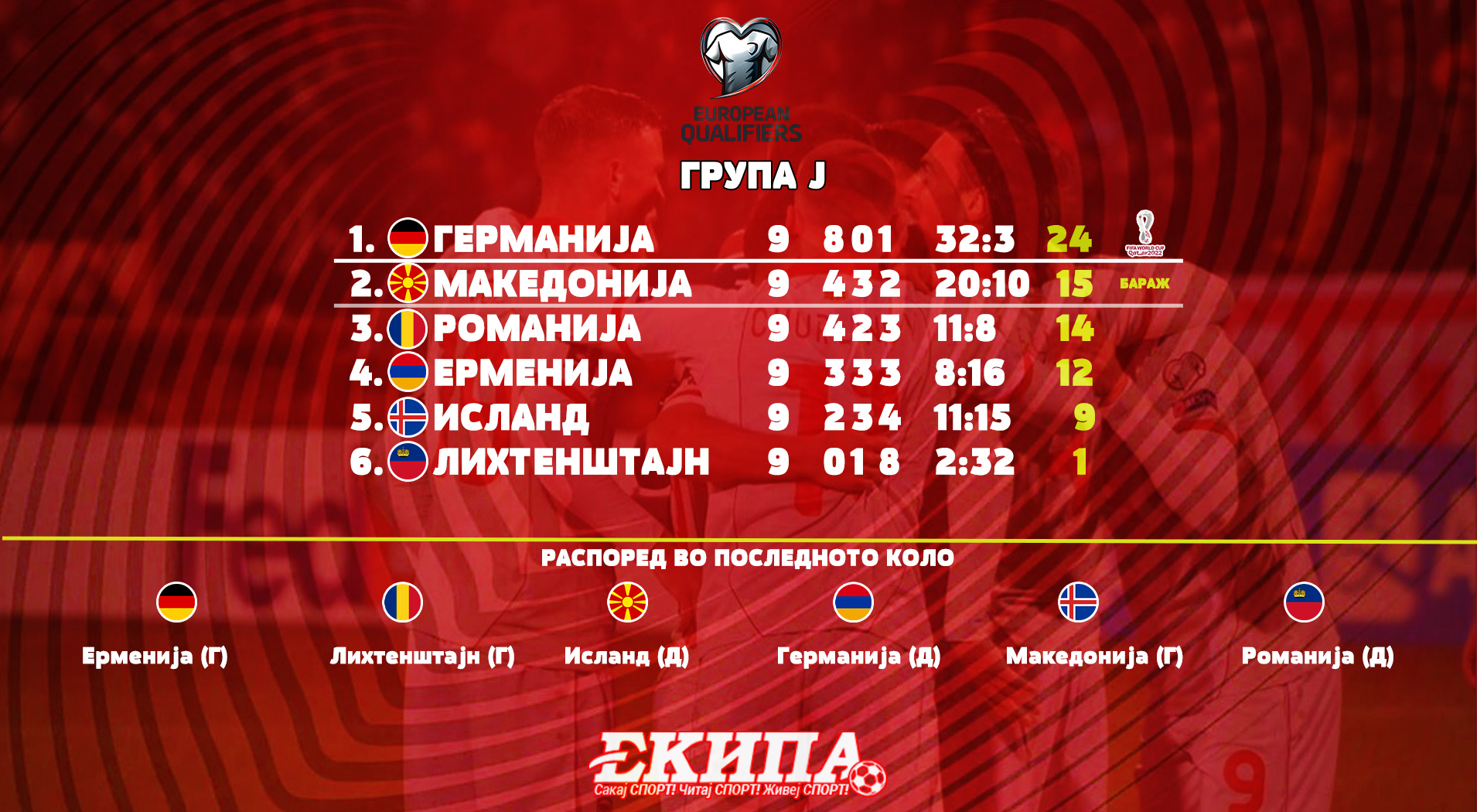 Македонија е пред почеток на живеење на мундијалскиот сон. За првпат во нашата историја македонската репрезентација е пред можност да се избори за бараж за пласман на светско првенство, што би бил и најголемиот успех низ еден квалификациски циклус.